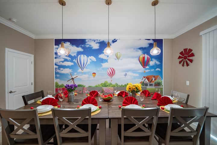 **European Wonder Living & Dining Room** (1st Floor): Dine in a setting inspired by the Netherlands, featuring colorful hot air balloons, windmills, and blooming tulips. Sit with loved ones in a spacious room beautifully decorated with works from European artists. Enjoy your favorite TV programs on the large smart TV.
