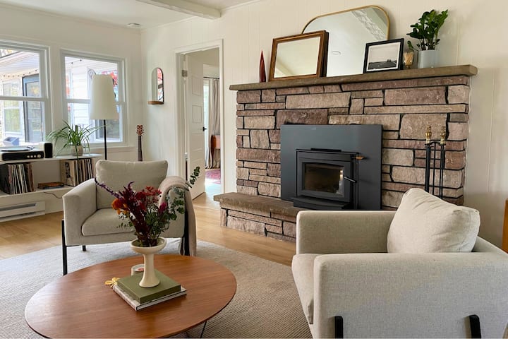 The living room is the heart of the home. In the center you will find a woodstove equipped with wood and fire starters. Enjoy the sounds of new and vintage tunes from our record player and collection.