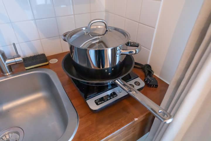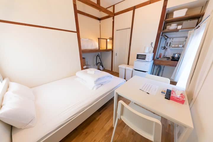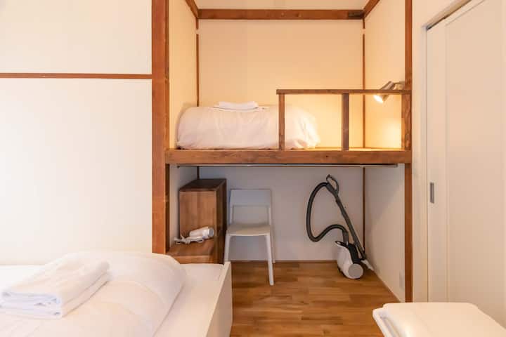 -The room has a double bed and a loft-like space with one futon, so it can accommodate up to 3 people. Couples and friends can stay comfortably.