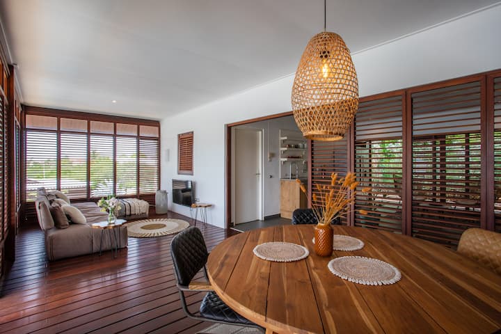 The villa is set in Vista Royal, a quiet and green district, just 1 minute walk from the salt pans of Jan Thiel a nature reserve with flamingos, mangroves and sweeping views. Start your day with a cup of coffee on the terrace, while the tropical breeze blows through the wooden shutters. The villa is designed for a naturally cool and open feeling of living, where indoors and outdoors are effortlessly overflowing.