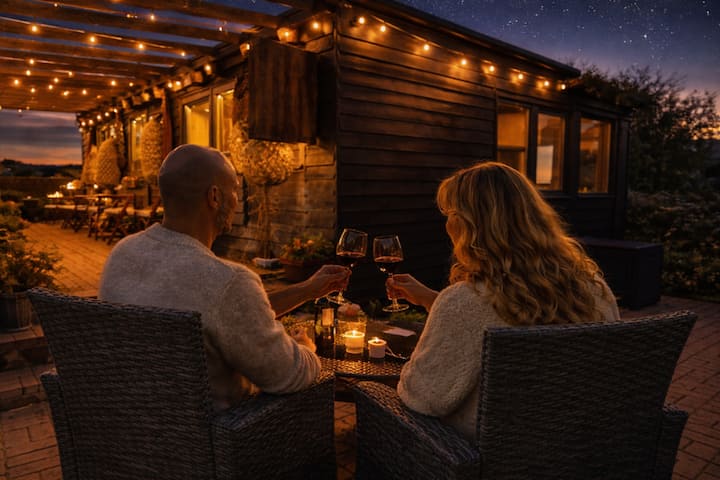 Shared BBQ & Fire Pit: Perfect for social evenings, you have full access to our communal fire pit and BBQ area, beautifully illuminated by festoon lighting for a magical nighttime ambience.