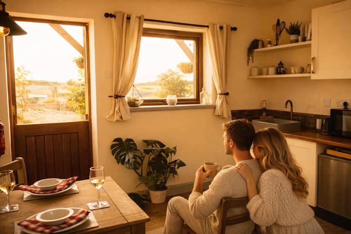 Stargaze together beneath a stunning skylight above your plush bed. Enjoy complete privacy in your cosy sanctuary with rustic charm, en-suite, and kitchenette. Continental breakfast included.