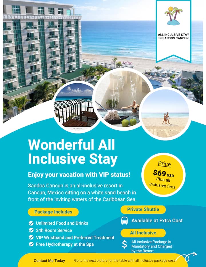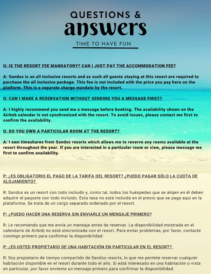 Our business, EBN Destinations Inc., owns timeshares from Sandos Resorts Vacation Club. It gives us access to discounted rates at all Sandos Resorts while receiving a black VIP members only bracelet and access to all the extras listed below. When you book with me, you are purchasing nights from our timeshare package and taking advantage of all benefits associated to it. The nightly rate listed here on the platform only covers the room rental which comes with the black bracelet. All guests must purchase the all inclusive package from the resort at time of reservation.