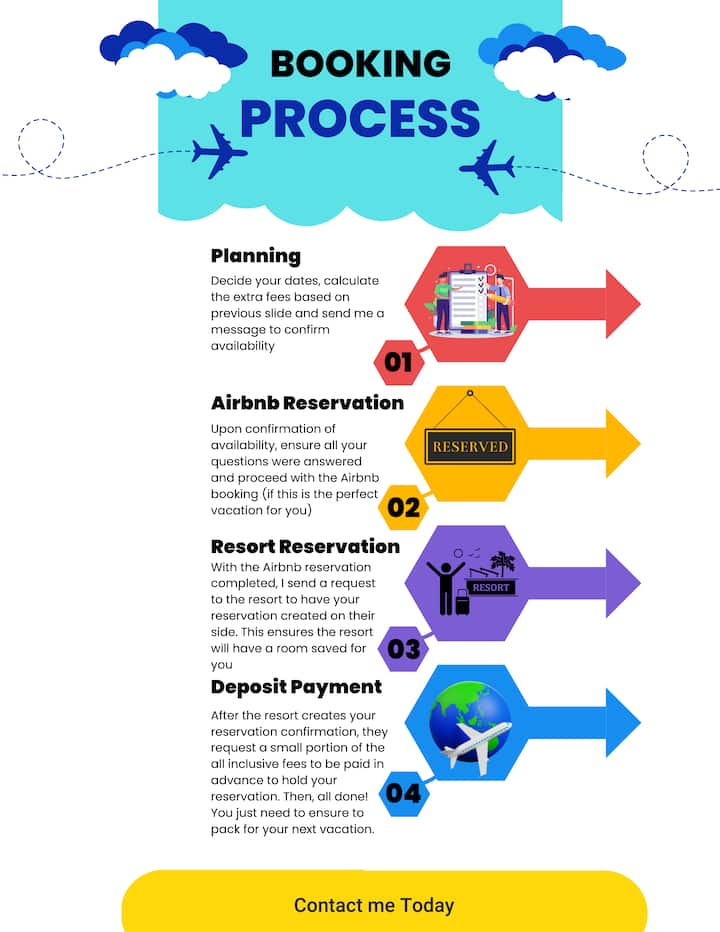- Availability must be confirmed before making a reservation. Contact me first and I am happy to check availability at the resort and provide a quote for the all inclusive package cost.