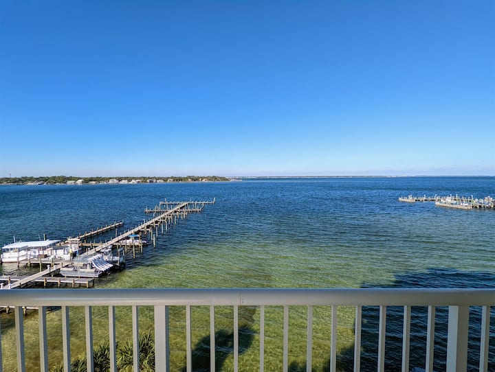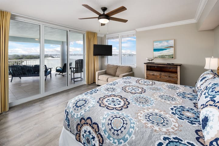 Heron 601 is one of the largest condominium units on Okaloosa Island (2,417 square feet) and provides outstanding views of the bay and the boardwalk / beach especially fantastic for watching fireworks! Destin West is one of the most unique complexes in the entire area because of the 700 foot lazy river, pier for boats and fishing, and beach!
