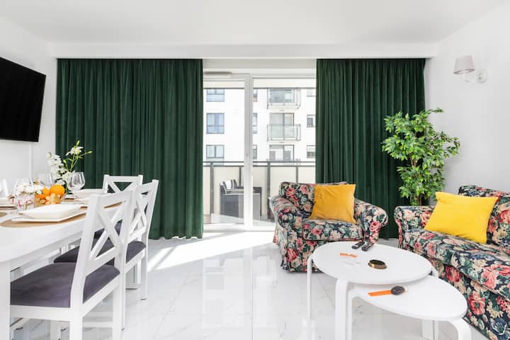 Modern designed interior of this spacious (78 m2) apartment is furnished in a way that provides the greatest possible comfort. The space of the apartment offers a living area with a kitchenette, three bedrooms with comfortable places to sleep, a bathroom with a bathtub, a separate toilet and a balcony. The apartment is fully equipped, and its tasteful, modern design and careful interior design encourage relaxation and rest. The apartment also has a desk, thanks to which guests traveling on business will find a comfortable place to work remotely. The colors of the apartment, the use of matching accessories, as well as high-quality equipment emphasize the atmosphere of the apartment. On the balcony, which overlooks the surroundings, you can relax or enjoy your breakfast outdoors, using the available garden furniture. The sublime and aesthetic interior with many amenities ensures maximum comfort of your stay.