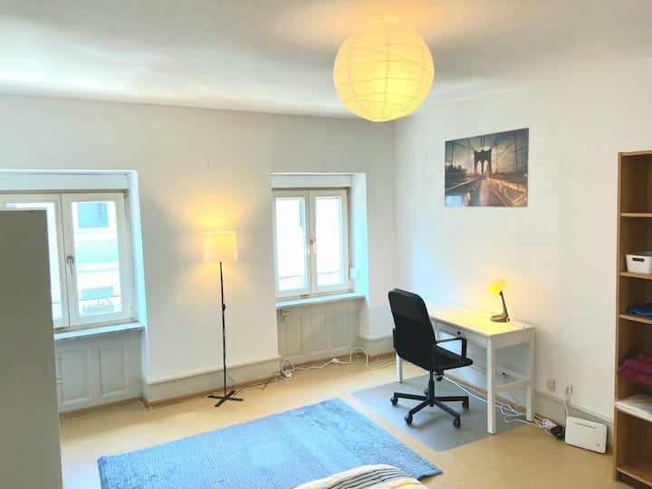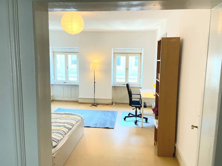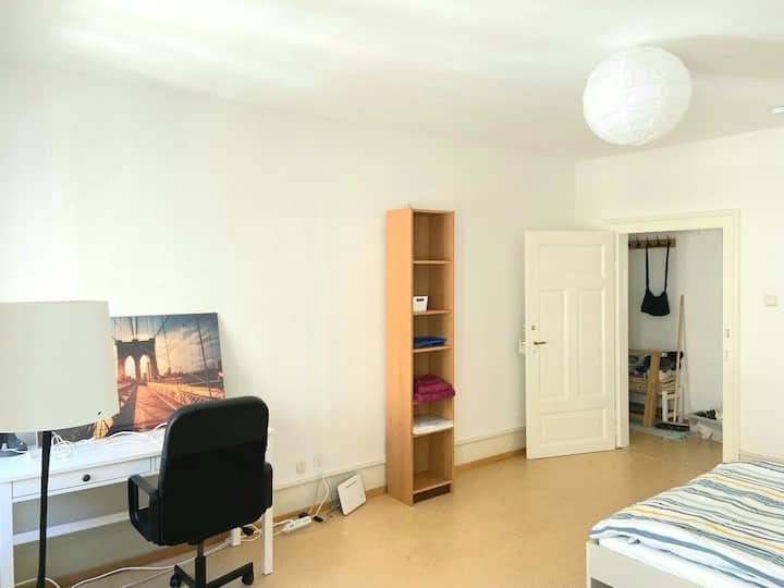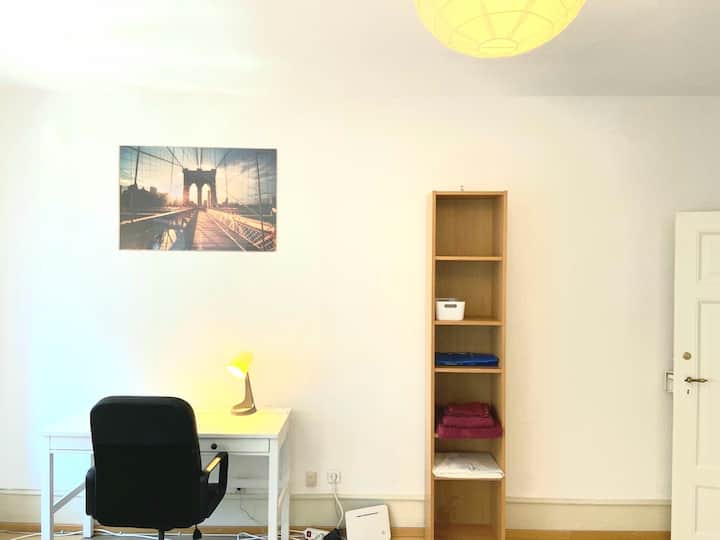Your room is on the 2nd floor (without an elevator) of a newly renovated old building apartment and impresses with its brightness and large rooms. In the apartment, each guest has their own room and you share the kitchen and bathroom with three other guests.