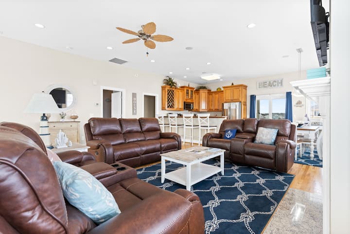 Take the stairs down to the second floor where you will find the other 4 bedrooms. Bedroom #2 has ocean views, a queen sized bed with a private bathroom, shower/tub combo. Bedroom #3 also has ocean views, a queen bed and private bathroom, shower/tub combo. Bedroom #4 has views of the Intracoastal, a queen bed and private bathroom, shower/tub combo. Bedroom #5 has 2 bunk beds with twin mattresses with one of the bunk beds having a trundle bed, sleeping a total of 5 in this room, also a private bathroom with a walk in shower. Also on this floor, you will find the NEW arcade games that the whole family will love.