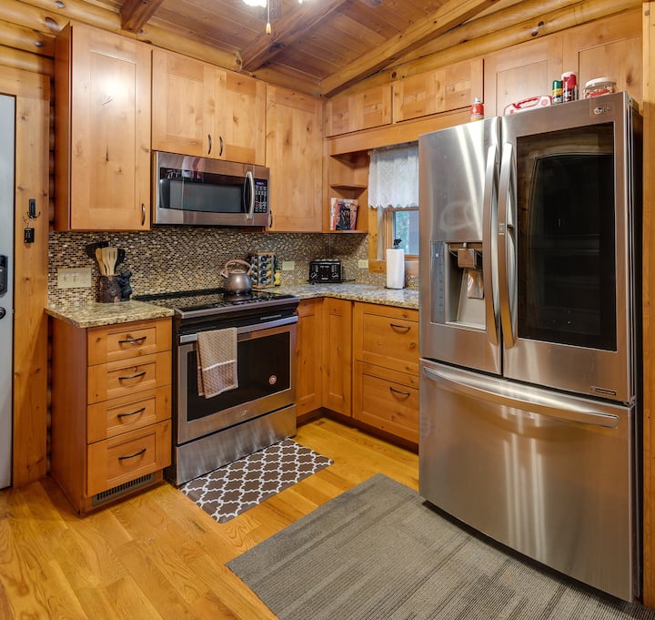 This cabin offers everything that a five-star experience has and more! The living room is the heart of the home with its warm, wooden paneling, fireplace and 70-inch TV. Gather your favorite friends or family together and settle in for a movie night with access to all your favorite streaming apps on the Smart TV. For guests working from home, connect to the Wi-Fi and catch up on emails at the dedicated office desk and chair.