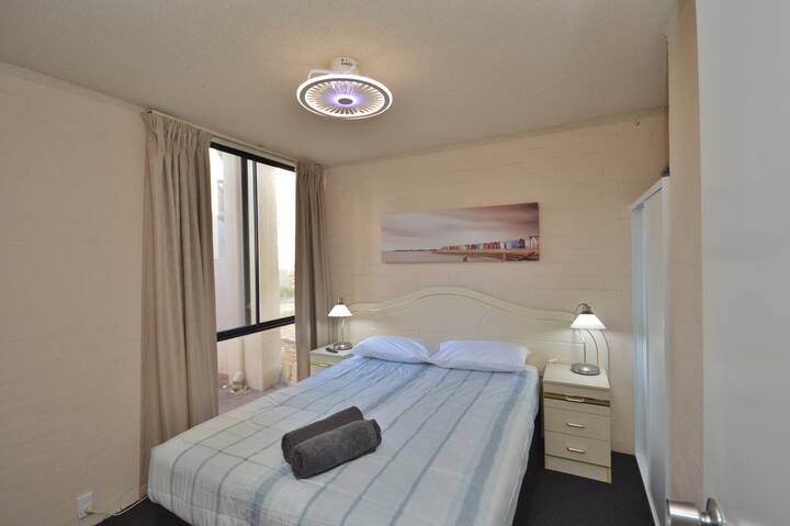 2 bedroom 1 bathroom ground floor Apartment, main bedroom has 1 x queen bed, second room has 2 x single beds. The Apartment has views of the playground. Reverse cycle split system air conditioner in the main living area, Lounge / Dining has a 40 Inch Smart TV .The kitchen has a Microwave, stove, oven, sandwich maker, fridge/freezer, (No washing machine ) The complex has a laundry, swimming pool, BBQs, and tennis courts please note you do need to bring your own Racquets and balls. This Apartment is Privately Owned.