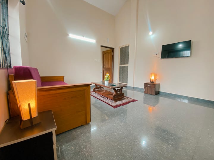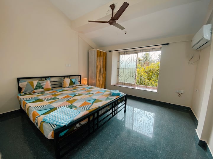 Stay at our comfortable 1BHK Beta in Neo Villas, located on the first floor. This charming unit features a king-size bed with a plush mattress and a spacious hall-equipped kitchen with induction and basic cutlery. Enjoy the convenience of a separate washroom, AC, and Wi-Fi. Public on-site parking is available, and pets are welcome with prior notice and an additional fee. Note that this property does not have a waiting area; early check-ins and late check-outs must be coordinated in advance.