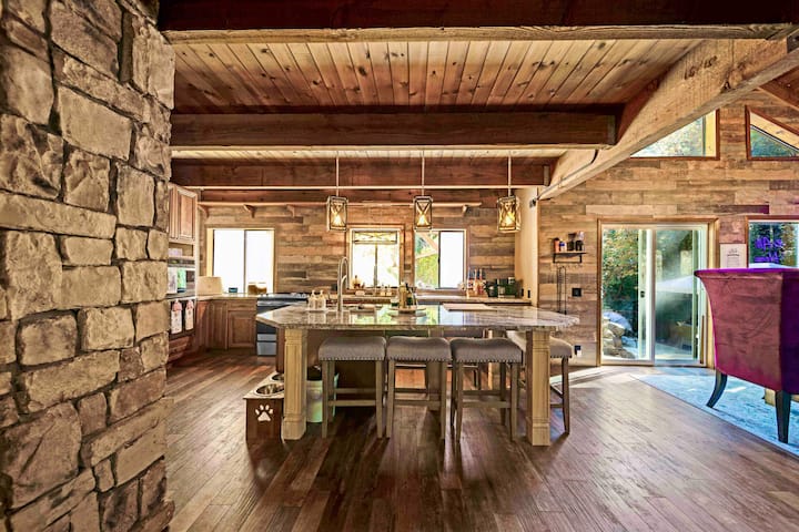 The main family/living room has an open design with vaulted ceilings, a gorgeous wood burning fireplace and a 75” LED Smart TV. We have Starlink WiFi and you can also access your own Netflix/Hulu/HBOMax accounts (no cable service) or fall down the rabbit hole and disconnect while at Wonderland.