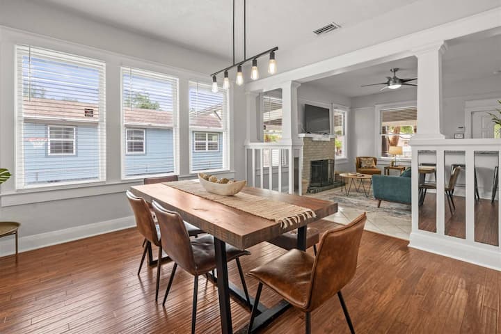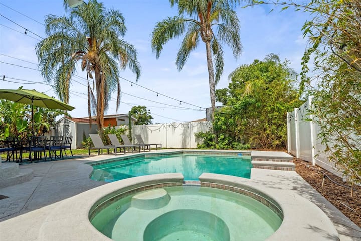 This Industrial Modern design themed home is located in an area of gentrification in Tampa and is complete with renovated kitchen, bathrooms, covered front porch with swing, private pool with heater(pool can be heated for an additional fee) & spa (spa can only be heated / no charge until 10:00pm), outdoor dining, & a fenced backyard that offers complete privacy for your enjoyment.