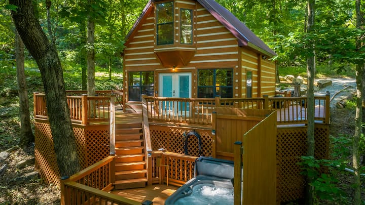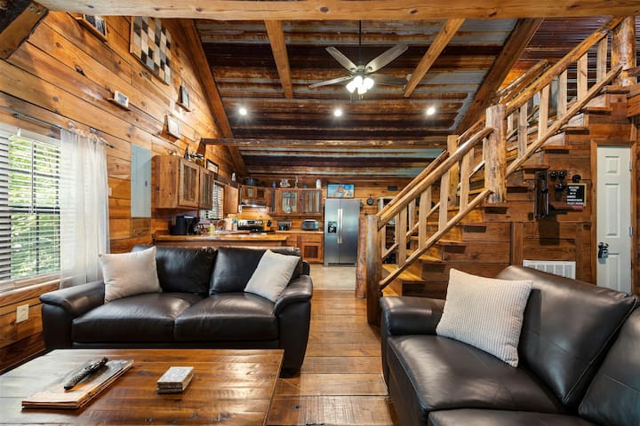 Cabin 1: “Hideaway Lodge” This Cabin is the larger of the two and boasts a gorgeous front porch with adirondack chairs and views surrounded by nature. Take advantage of the hammock, fire pit, and grill right outside! When entering the home, you walk into the open concept living room, kitchen, and dining area. This Cabin comfortably sleeps 6 guests and has a huge bathroom with a standing rain shower and a jacuzzi tub! There is one large bedroom downstairs with a King size bed and the second bedroom is the upstairs loft space with two Queen beds and a private balcony!