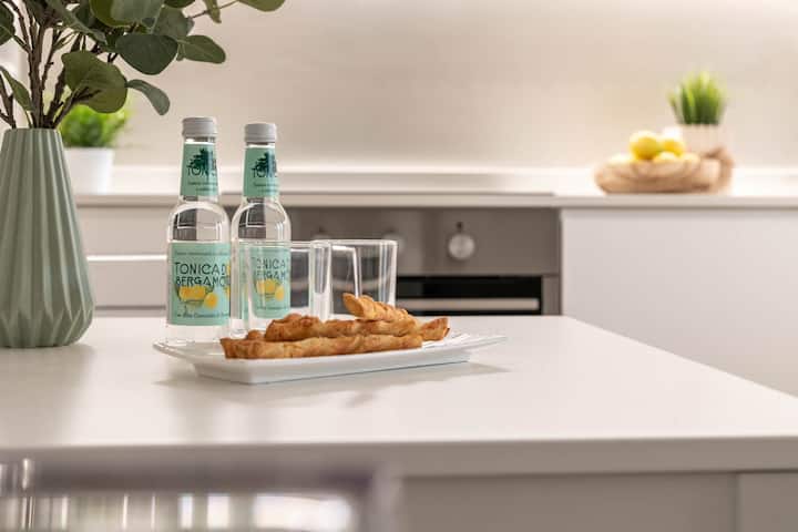 In the refined living room, there is a complete kitchen, handcrafted by local carpenters and marble workers with top-of-the-line materials. In addition to the induction cooktop, oven and fridge, the kitchen is equipped with a microwave, kettle, toaster and Nespresso coffee machine.
