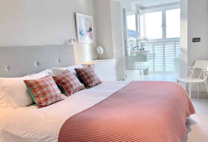 The master bedroom has ambient lighting throughout, a superior super king size bed, custom built fitted wardrobe with shelving and hanging space, full length wall mounted mirror, small bedside table, large chest of drawers, and a small wall mounted TV (Freeview channels). The room encompasses a luxury bathroom with views across the estuary and beaches.