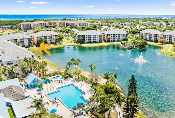 Located on the ground floor - a large screened in balcony with lovely views of one of the community lake which is located just across from Jupiter Beach.