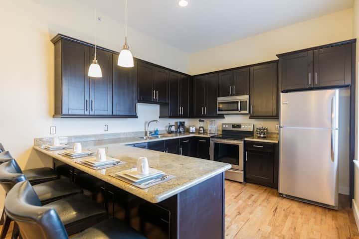 In the evenings, sink into plush bedding in a tranquil bedroom retreat or unwind in the stylish lounge with your favorite show on the large flat-screen TV. Thoughtful details—like custom decor, designer lighting, and in-unit laundry—add comfort and sophistication to every moment of your stay.