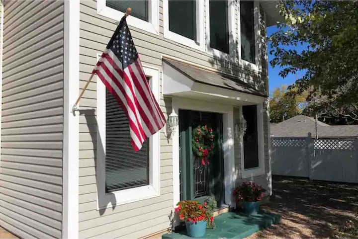Our large, beautiful 2-story, 3-bedroom, 2-and-a-half bath home on “Heroes Boulevard” is the perfect retreat for you and your family. The home features 2 huge master suites with adjoining baths and a third bedroom - all with premium bedding, living area, a half bath, kitchen, separate breakfast and dining areas, washer and dryer and a beautiful park-like setting in the backyard with outdoor grill. Enjoy the huge soaking tub, plenty of room for the little ones to run around and free Wi-Fi.