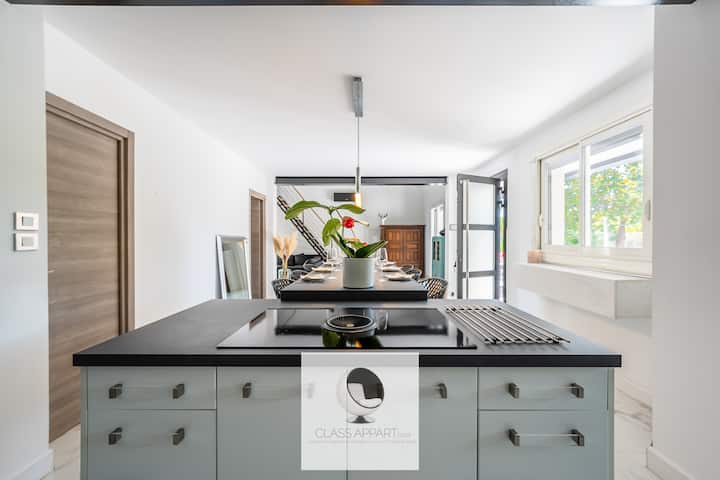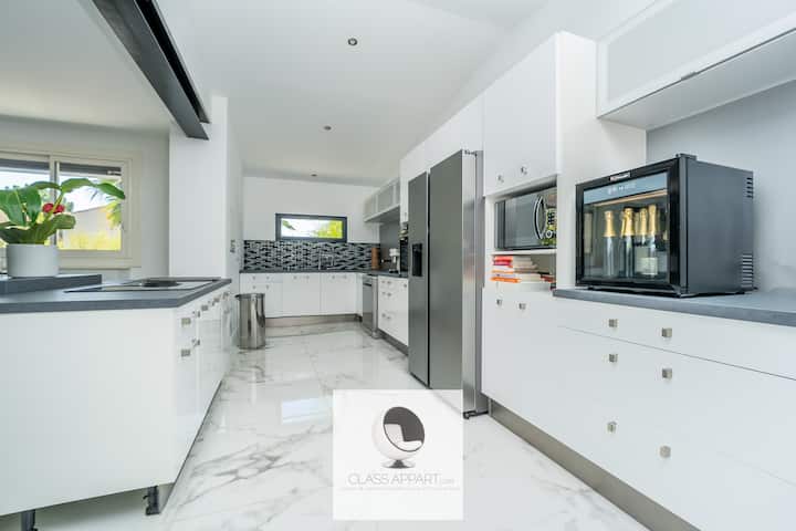 On the ground floor is a large "open space" living room including: A large over-equipped kitchen (washing machine, refrigerator, wine cellar, washing machine...), a central island for meals in a friendly atmosphere and a cathedral living room (high ceiling).