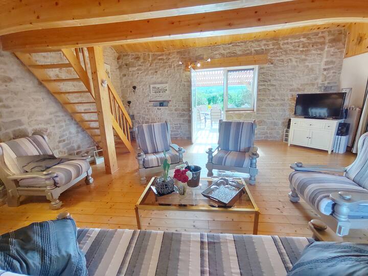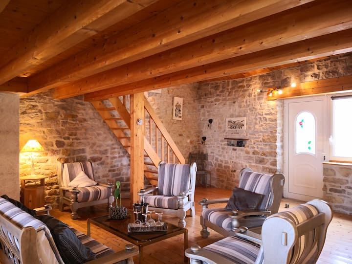 Next to the table, comfortable garden furniture invites you to relax and enjoy the moment. An elegant and functional barbecue and a plancha are ready to welcome your culinary creations. Facing your terrace, a garden, decorated with shrubs and fruit trees dot this landscape, offering a breath of fresh air and a breathtaking panoramic view of the beautiful Jura landscapes.