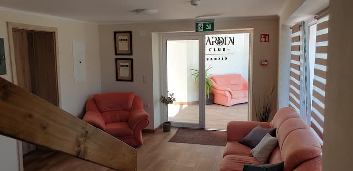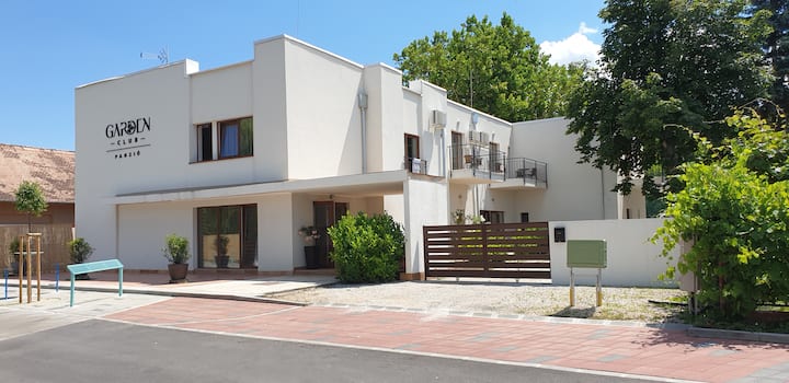 In the heart of the Balatonmáriafürdő resort, on the pedestrian street, 150 meters from the central beach, the completely new Garden Club Panzió is located. The accommodation awaits its guests in a landscaped, green area with 13 high-quality furnished rooms and its own tennis court.
