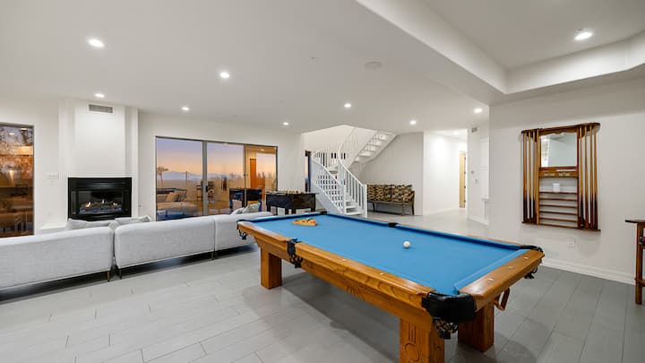 Sip sunset cocktails in the spa as the valley lights begin to twinkle. Play a casual game of cornhole or sink a few putts before diving into the pool with its cascading waterfall and fire-lit backdrop. Inside, floor-to-ceiling windows draw nature in, while two kitchens, multiple gathering areas, and a private theater offer space for celebration and solitude alike.