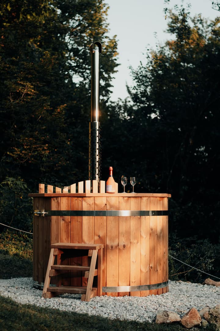 We invite you to slow down, curl up with a good book and warm coffee, unwind in the wooden tub under the stars (extra cost 40€/heating) and enjoy the complete tranquility to create unforgettable memories.