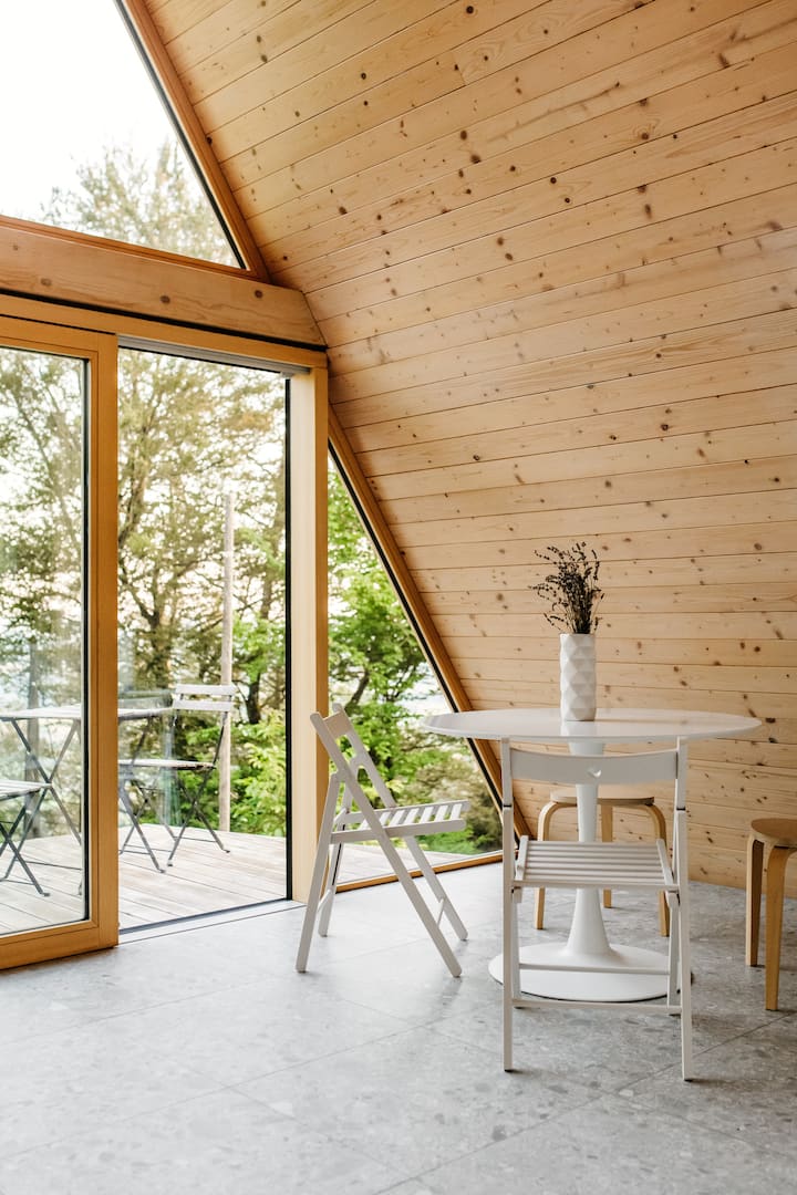 Inside the newly renovated, wooden A-frame holiday house, will greet you an open plan living, dining and kitchenette area with loft-style bedroom on the upper floor (steep stairs!). A modern designed bathroom with a view of the forest will make your showers breathtaking. For the cherry on the top, a terrace surrounded by pure nature and wooden tub will make your stay even more chill.