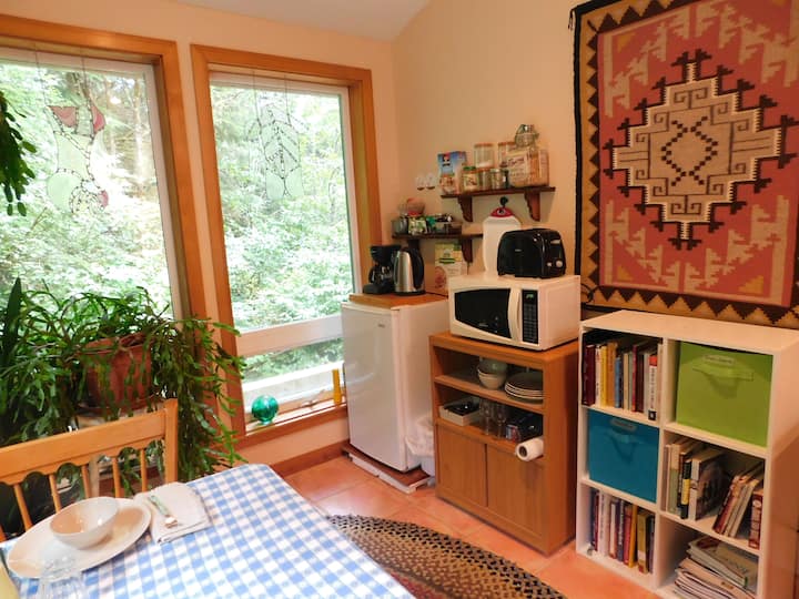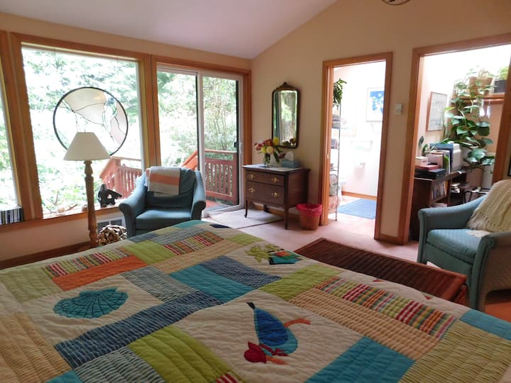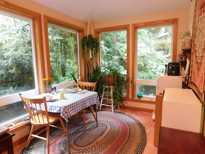This rental is a GUEST SUITE made up of a large bedroom with king sized bed (can be configured as two twins), private bath with shower, walk-in closet, and sun room with kitchenette in a private home. Travelers stop here when going from San Francisco to Seattle and back. This space is perfect for a romantic get-away, or a creative intensive to write or paint without distraction. Consider a solo retreat as a special gift to yourself or shared with your pooch! (Please check with me about your dog coming along!) Schedule a nourishing Reiki Energy Treatment, or Singing Bowl activation!