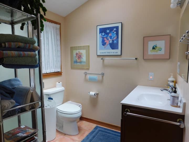 When you arrive parking can be done to the far right of the paved area or using an open car port bay if your vehicle fits! Come to the front door and either my adult son David or myself will welcome you to your private Guest Suite, separated by French doors from host's quarters. Laundry facilities (1 load) are available by special request. This space is accessible to those with disability and am glad to work with you to fine tune what improves your comfort and access. I have infant/toddler pack and play + bedding and high chair to make your little person's stay more comfortable! Note: the step into the house via the front door is 6" and wide enough to accommodate wheel chair access.