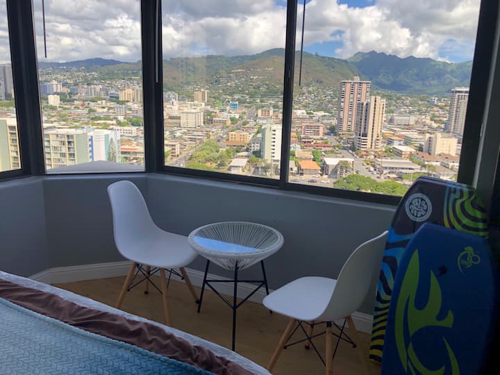 One of the best views in a building known for its views! Smallish, 247 square feet, with everything I myself would want as a guest, including no cleaning fee, and great price! Short walk to beach, Ala Moana Shopping Center, and the Convention Center. Queen bed plus two twin floor mattresses (sleeps four in a pinch), large refrigerator, microwave, AC, Netflix, WiFi, plus extra amenities such beach wagon and chairs, cooler, boogie boards, sand toys, crib. Childcare service and pop-up tent extra.
