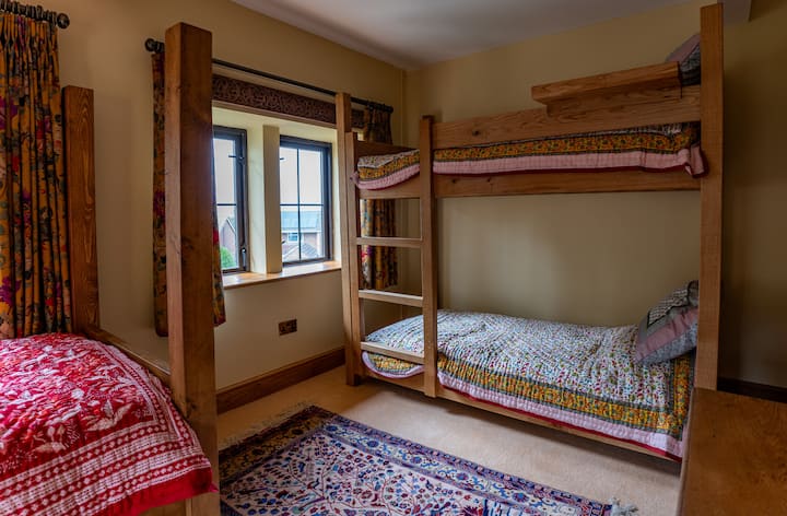 There are three single beds in the Quicksilver Dorm. One is a stunning four poster single bed & the other two are handmade oak adult bunk beds. This listing is for the single four poster bed. There's plenty of clothes space & a washbasin.