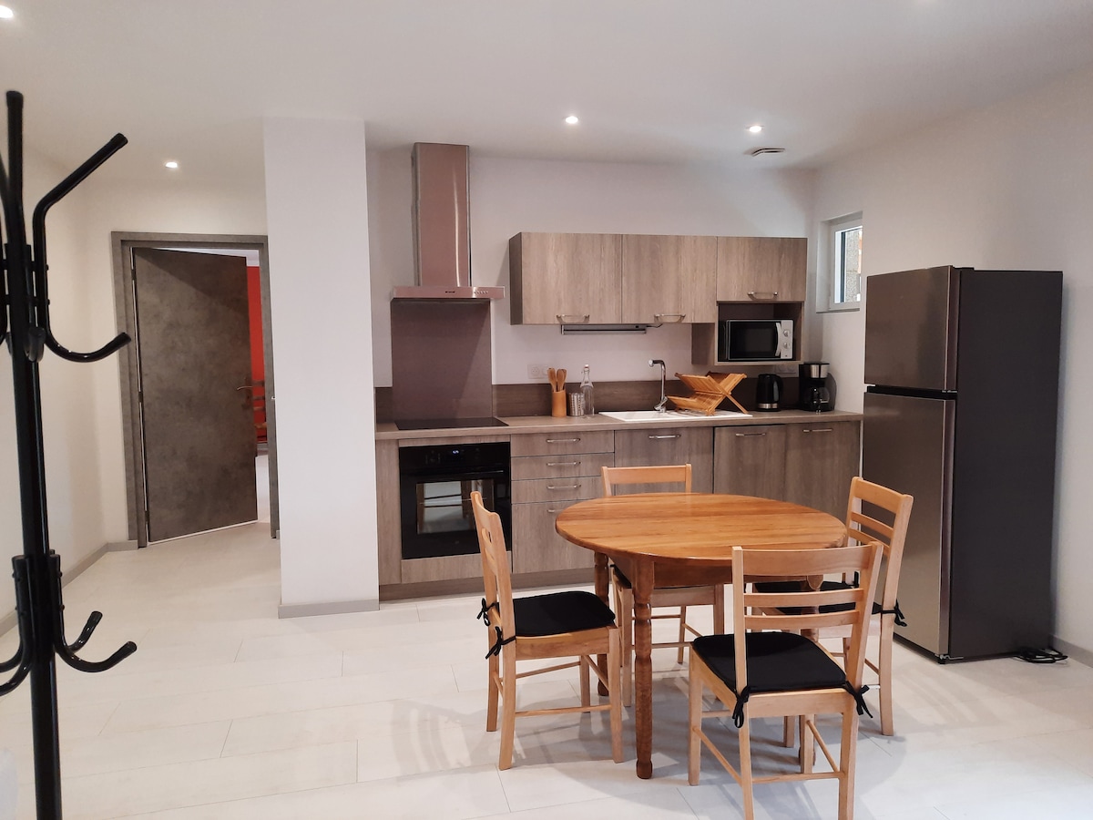 Ce logement occupe une ancienne étable voûtée , à laquelle nous avons rajouté une construction plus moderne pour l'aménagement d'une cuisine et d'une salle de Bain. Nous avons essayé d'apporter une ambiance chaude et poétique, en utilisant un mélange pierre et bois. Grâce à de grande porte vitrée cette appartement et lumineux. A vingt minutes à pied, vous pourrez rejoindre un plan d'eau (en été). Nombreuses randonnées pédestre ou à bicyclette.