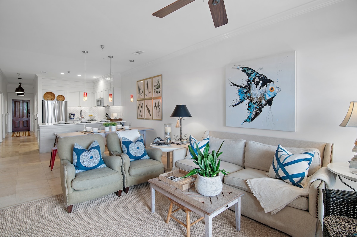 Soak up 30A life! Twickenham is a bright 2BR/2BA condo that gives you quick beach access, a sparkling community pool and a private electric cruiser for easy exploring. • Comfy bedrooms with premium linens • Kitchen stocked with cookware, dining ware, coffee, and more • Free bikes, beach gear & parking • Smart TVs + high-speed Wi-Fi • Outdoor security cameras • Pet friendly Superhost, 100+ glowing reviews! Reserve your dates now before they disappear.