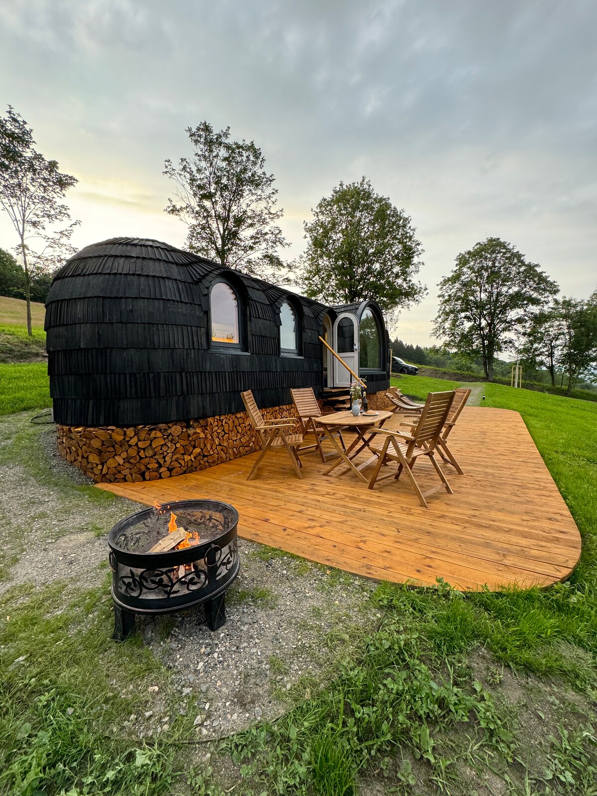 Welcome to our cozy wooden igloo. Relax in the amazing sauna and enjoy the terrace with a grill. There are other igloos nearby, 120m away. All igloos have air conditioning. They are located in the picturesque Bohemian Uplands, near the Pravčická brána, Tiské skály and other beauties. Immerse yourself in the silence of nature, find peace and quiet. Watch the sheep grazing nearby. Your stay helps us to bring life back to the romantic ruins of the Skrytín chateau.