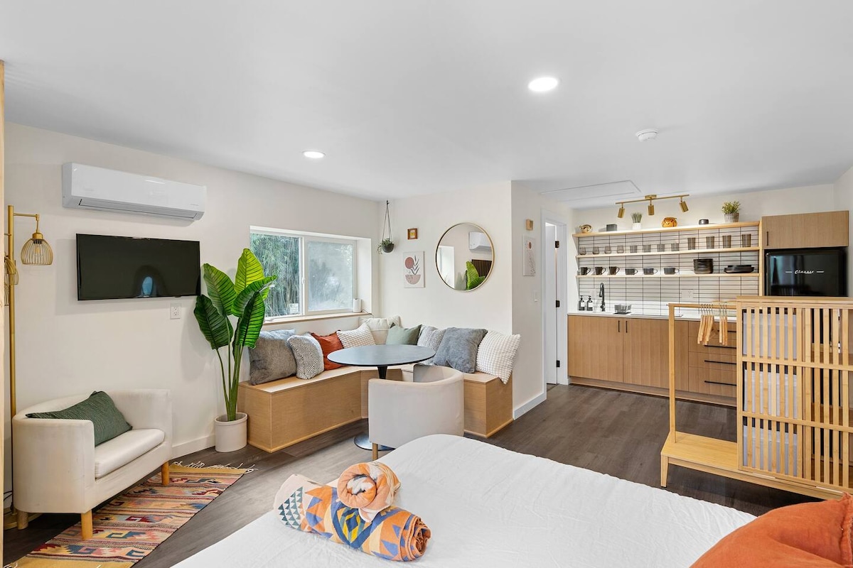 Located within a charming Westmoreland bungalow home is this separate private studio just a short 7-minute drive to the heart of Portland. The studio features soft comfortable furnishings, access to streaming apps on the Smart TV, a fully equipped kitchenette, a sparkling full bathroom, and a spacious living area with a modern open plan design. Walk or bike to coffee shops, grocery stores, restaurants, breweries and the popular Westmoreland Park all right on your doorstep.
