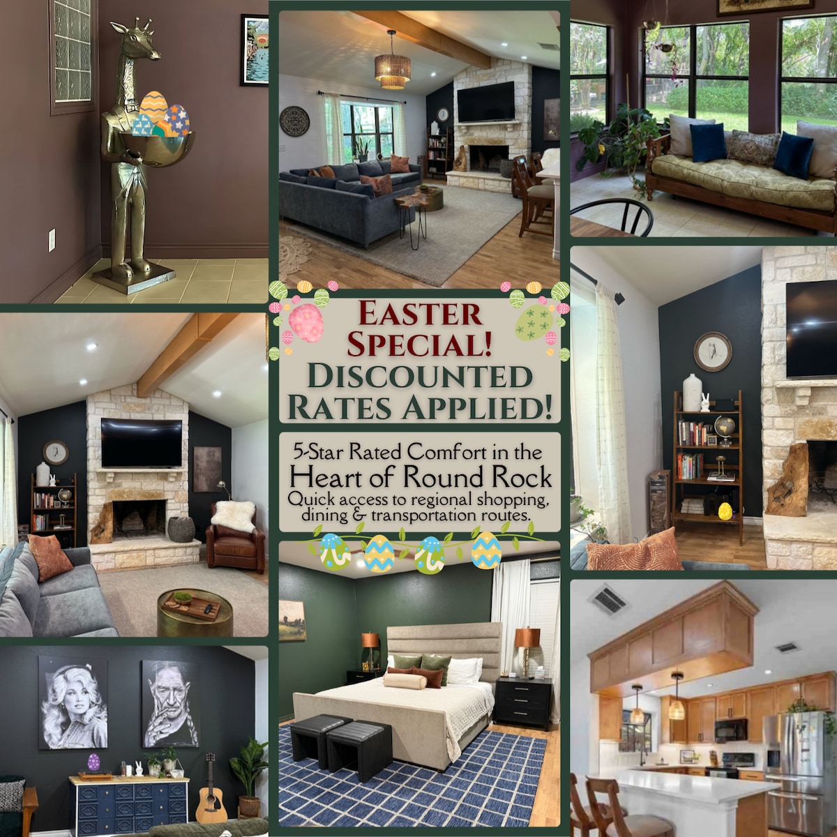 Welcome to The Rock House, a pet-friendly, 3-bedroom vacation rental in Round Rock, TX, just 23 minutes from Downtown Austin. Designed for families, groups, and getaway seekers, this mid-century home blends boho-chic style with laid-back luxury. Enjoy an outdoor hot tub, fireplaces inside and out, and a peaceful, private yard under the Texas sky. Whether you’re here to explore Austin or unwind in quiet comfort, The Rock House delivers space, style, and serenity.
