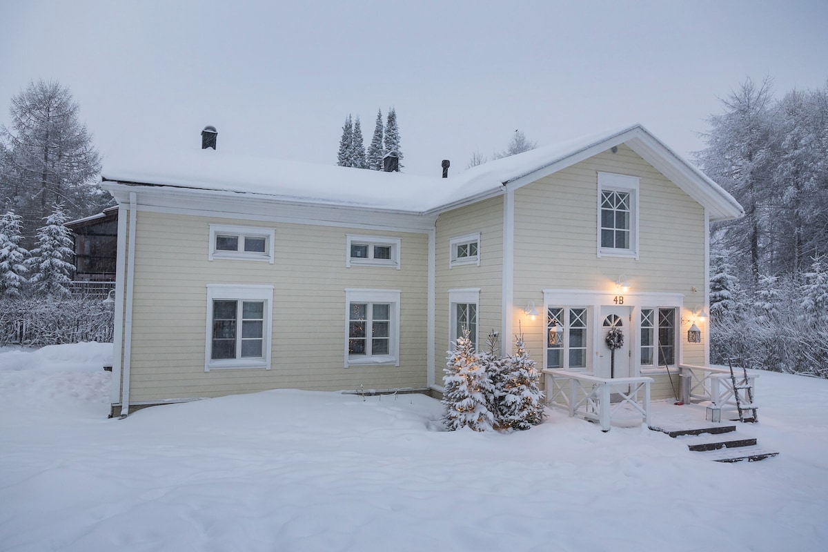 Welcome to enjoy your holiday in Rovaniemi and be our guest. Cozy 50m2 apartment of a familyhouse by a river: Kitchen, livingroom with sleeping loft, bathroom, balcony, underground sauna and jacuzzi (extra price), barbecue and parking place. There are four beds (one double and two singles) and if necessary baby's bed. Apartment is located in a peacefull familyhouse area and it takes 5 min drive and 20 min walk to city center. Supermarket is very close also (2 min drive and 10 min walk).