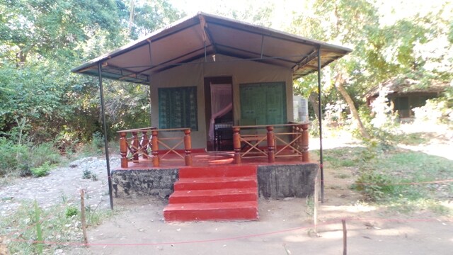 A safari tent features a covered porch area with two wooden chairs, inviting relaxation. Surrounded by lush greenery, the tent structure is open to natural light, with the entrance flanked by trees. The setting provides a connection to the tranquil outdoor environment.