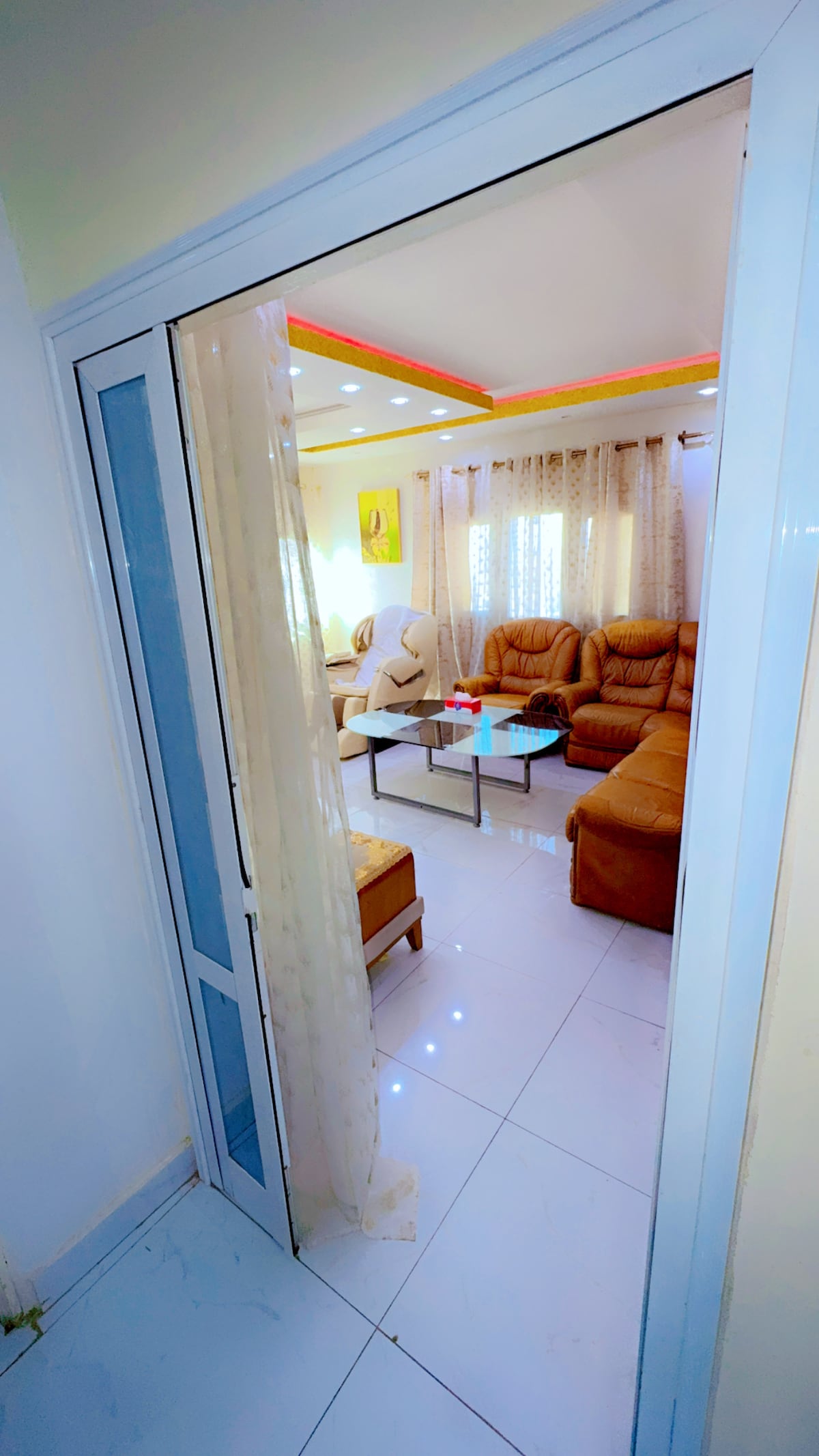 Luxurious furnished 3-bedroom apartment at the Cité des Fonctionnaires de Diamniadio. 2 air-conditioned bedrooms with bathroom (hot water, Jacuzzi) and American-style kitchen/living room. • Equipped kitchen: dining room; washing machine; iron; coffee machine; toaster; blender; microwave; refrigerator, etc. • Living room: large TV and satellite channel subscription; WIFI; Close to shops, 30 minutes from Saly and Somone beach; Mbour, 10 minutes from AIBD airport; 30 minutes from Dakar city center