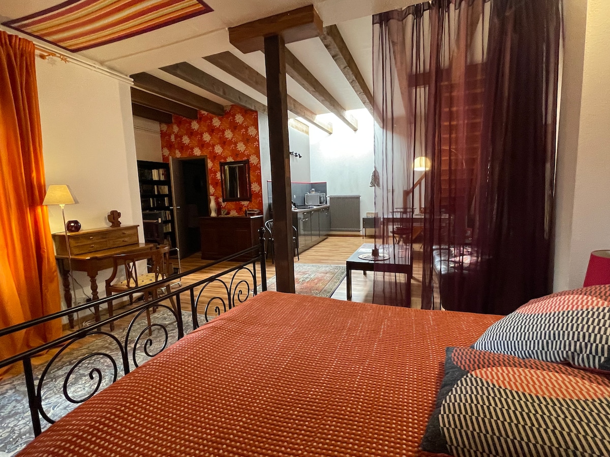 Located on the top floor of a house built in 1790, in the heart of the beautiful Alsatian city of Colmar, this duplex, completely renovated in 2018, will seduce you with its charm and comfort for a getaway for two. Its neat decoration consists of: - on the ground floor, a bathroom with walk-in shower (towels provided), a large fully equipped kitchen, a sitting area with 32" screen TV - upstairs, a 140 cm bed (very firm mattress, bed linen provided) and separate toilet