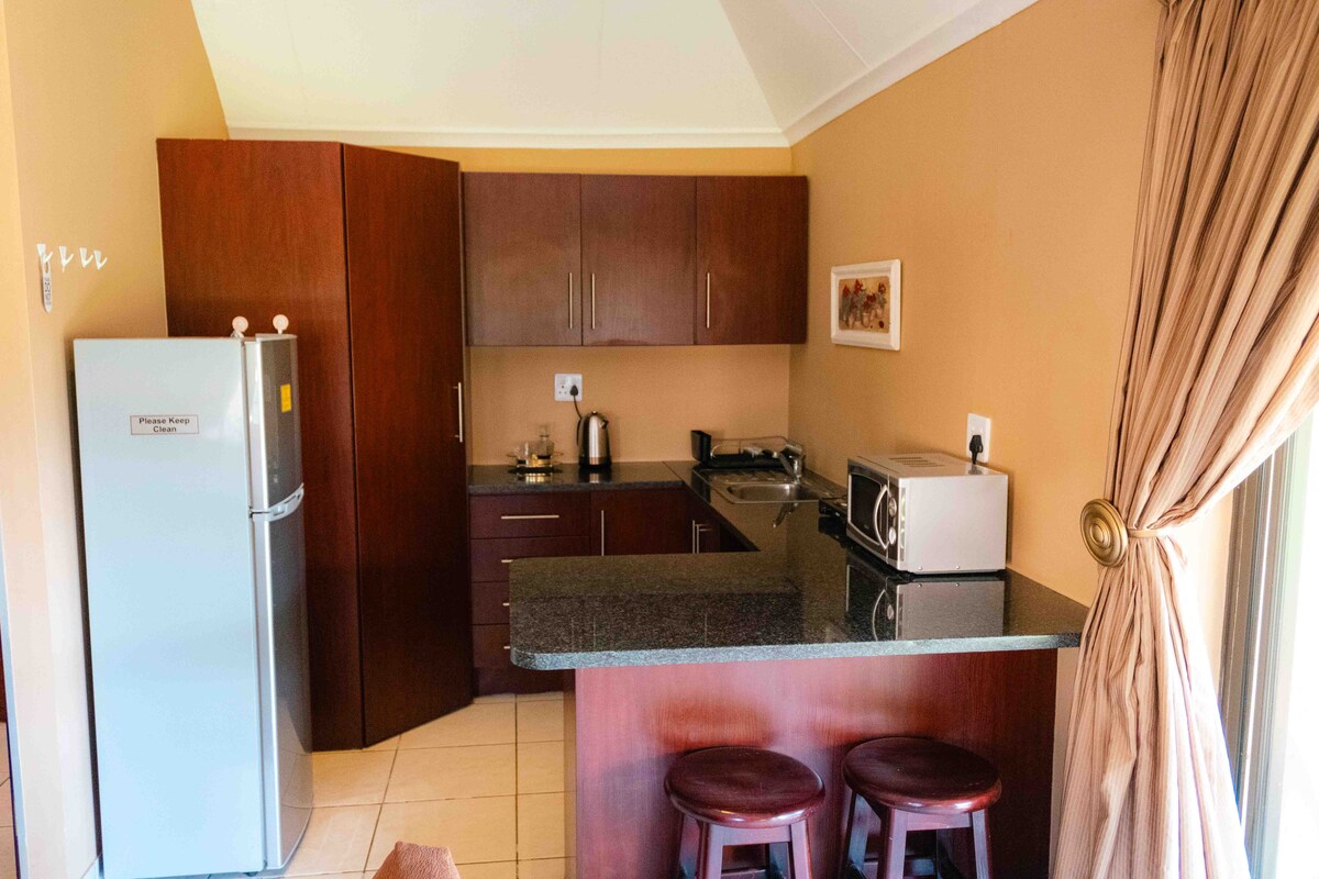 Spacious 2-bedroom chalet featuring a double bed in the main room and two single beds in the second. The open-plan kitchen, dining area, and lounge provide a comfortable space for cooking, dining, and relaxation. The bathroom is equipped with a shower. Outside, enjoy covered parking, a braai area, and garden seating. Located in a secure guesthouse with night security, ideal for families, groups, or business stays in Rustenburg.