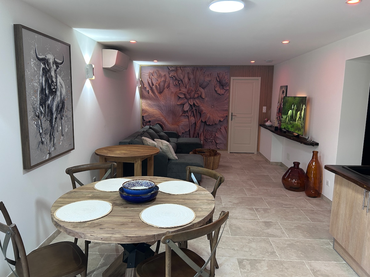 Two Comfortable Bedrooms: Bright, comfortable beds. Modern Bathroom: Shower, washing machine. Separate toilet: More privacy. Equipped Kitchen: Prepare friendly meals. Sunny Terrace: Outdoor breakfasts. Modern amenities: Wi-Fi, air conditioning, parking included. Ideal location: Shops nearby, 5 min from the greenway to the Pont du Gard for bike rides. For a vacation, business trip, or a relaxing short stay, book an unforgettable experience!
