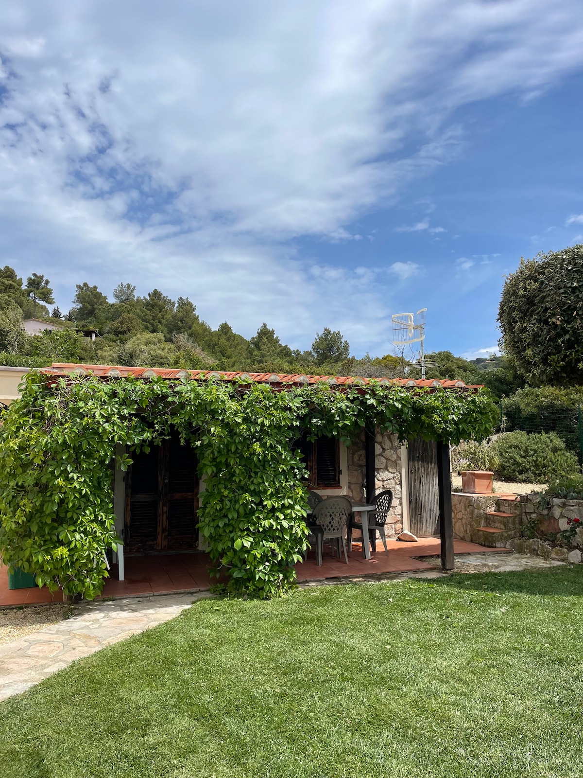 Delizioso appartamento arredato con cura, in stile etnico, provvisto di ogni comfort, in un casolare appena ristrutturato secondo i principi della bioedilizia, immerso nella macchia mediterranea del più bel versante dell'isola d'Elba, con vista mozzafiato sull'arcipelago toscano e sulla Corsica, a 250 m sul livello del mare, dominante la spiaggia di Cavoli. L'appartamento è composto di soggiorno con angolo cottura e divano-letto per due persone, camera matrimoniale e bagno con doccia e ampio spazio esterno attrezzato per pranzare e prendere il sole. Il luogo è raggiungibile con una strada sterrata di 2,5 km dal paesino di San Piero in Campo (fin dove arrivano i mezzi pubblici), distante pochi minuti di macchina dalle spiagge più incantevoli dell'isola (Cavoli, Seccheto, Fetovaia) e dal centro turistico e commerciale di Marina di Campo. E' consigliabile disporre di un mezzo proprio. La casa è immersa nella tipica macchia mediterranea alternata a grandi e suggestive scogliere di granito. Il grande giardino è recintato, contiene un orto e un uliveto. Non vi sono altre abitazioni nei dintorni. Intorno alla località si snodano i più suggestivi sentieri per gli amanti del trekking e della mountain bike. Ideale per chi è in cerca di silenzio, relax, aria pura, e ama la natura e i luoghi un pò speciali. I padroni di casa potranno aiutarvi per ogni evenienza e perplessità. BREATHTAKING VIEW ON THE ARCHIPELAGO Charming apartment,furnished in ethnic style,with every comfort,in an old cottage just renovated according to the bioarchitecture,amidst the Mediterranean bush in the most beautiful part of Elba island with breathtaking views on the Tuscan archipelago and (email hidden) a.s.l.,overlooking famous Cavoli beach. The apartment has a living room with kitchenette and divan bed for two persons,a double bedroom and a bathroom with shower and a large outside patio for eating and sunbathing. You can reach the place through a 2,5 Km dirt road from San Piero in Campo,where pubblic transport ends,and from where ,in few minutes by car you can get to the best beaches of the island (Cavoli,Seccheto,Fetovaia etc.),and to the touristic and service centre of Marina di Campo. It's better to have your own car or motorbike(you can rent it anywhere on the island). The house is surrounded by the typical mediterranean bush scattered with huge granite cliffs. The large garden has an olive grove and a vegetable garden. The place is secluded and there are no other houses in the surroundings. It's an ideal place for trekking and mountain biking and lovers of relax,peace,nature and special places. Your host are ready to help for any need and request.