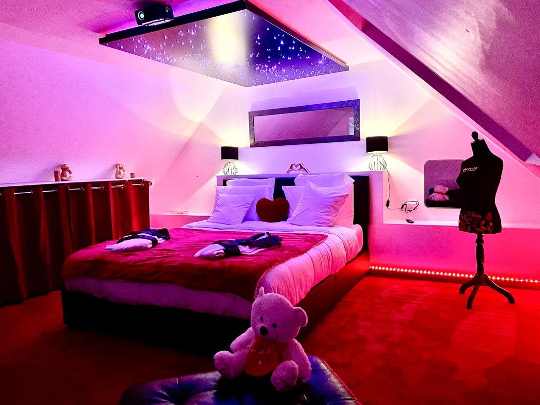 Étoiles & Désirs – Romantic getaway in Kermaria-Sulard, near Perros-Guirec and the Côte de Granit Rose. Let yourself be enveloped by the starry ceiling, the queen-size bed and the walk-in shower. Cosy living room, fitted kitchen, private garden, wooden terrace with pergola and barbecue. Internet, Netflix, video projector. A getaway for two, with privacy and comfort guaranteed.
