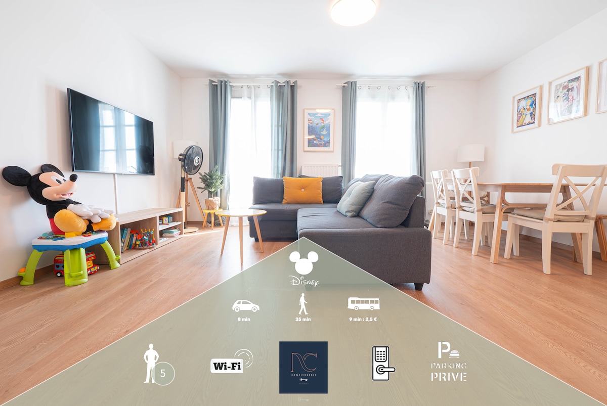 Best area with a cozy new flat ideally located at Val d'Europe, near Disneyland Paris: - Access to the park: 25 min on foot, 10 min by car, taxi/Uber or via RER located 600 m away. - Access to central Paris in 40 minutes via RER. - 700 meters walk from the Val d'Europe shopping center, Vallée village outlet. - Direct proximity to all shops (Carrefour, bakery, brasseries, Japanese, Italian, burger, Korean, etc.). - View of the Tower of Terror and its drone show from the terrace in the evening :-)
