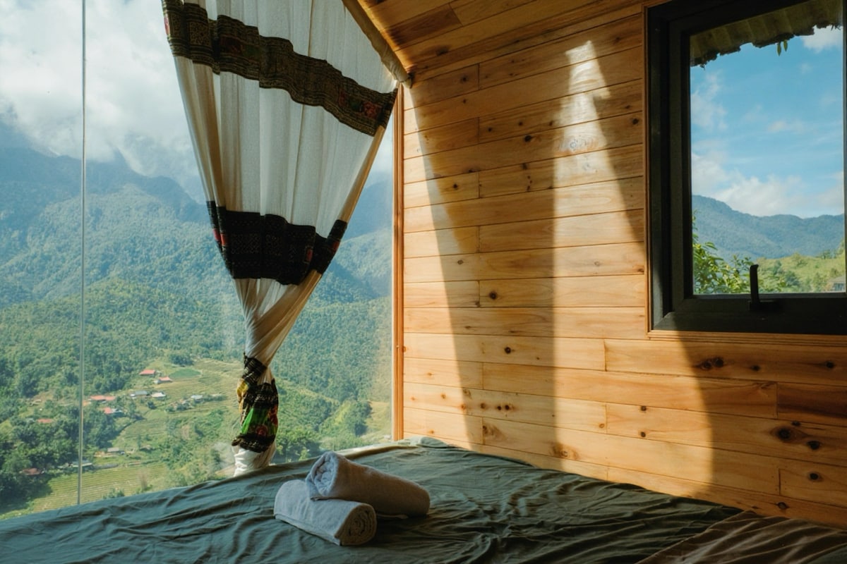 Experience the true spirit of Sapa, just 10km from the town center — peaceful and surrounded by mountains. * Separate wooden chalet for up to 3 guests * Large glass windows with mountain & rice terrace views * Fully equipped kitchen (fridge & cooking utensils) * Fireplace, heater & heated mattress (cozy in winter) * Spacious modern bathroom with hot water & heating * Outdoor garden with panoramic views