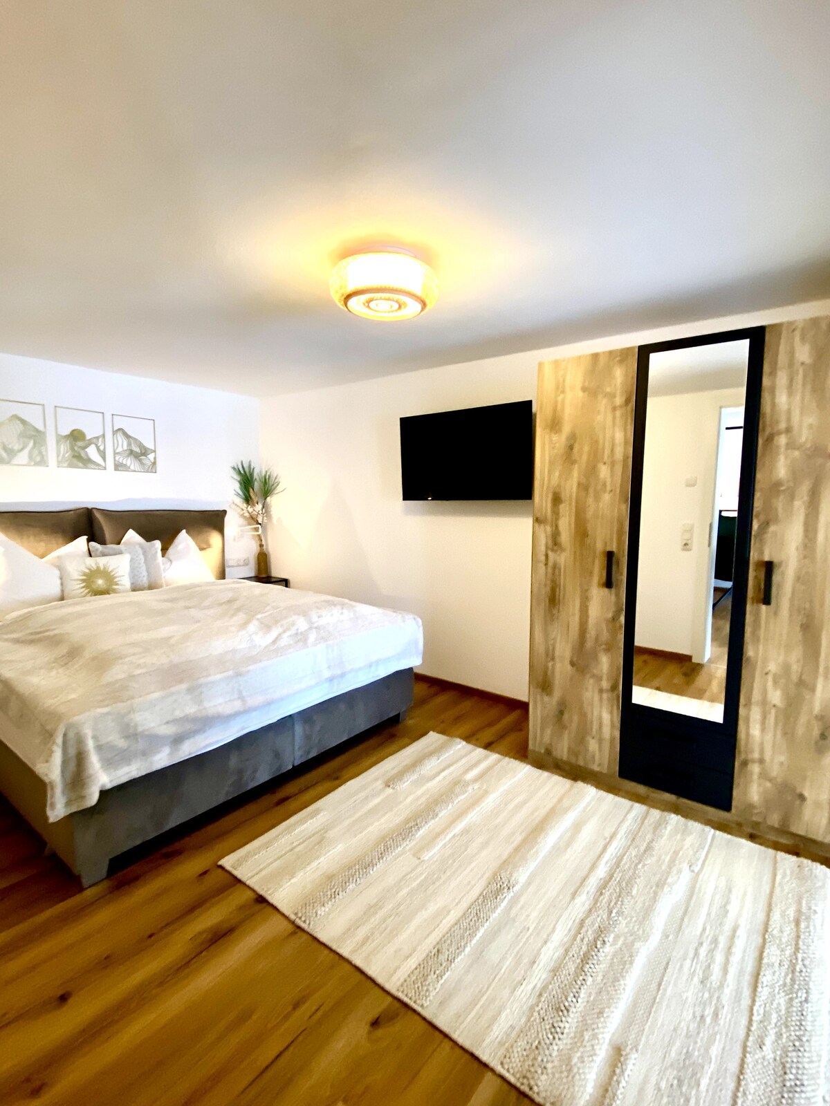 The 75 m² apartment is located on the top floor and faces west. The extra-large panoramic windows provide light-flooded rooms and great views. The apartment is equipped with modern, stylish and high-quality furniture. You will find everything you need for a pleasant stay. Enjoy unforgettable hours at sunset on the spacious balcony with terrace. In our apartment building there are a total of 2 apartments for a maximum of 7 people each.