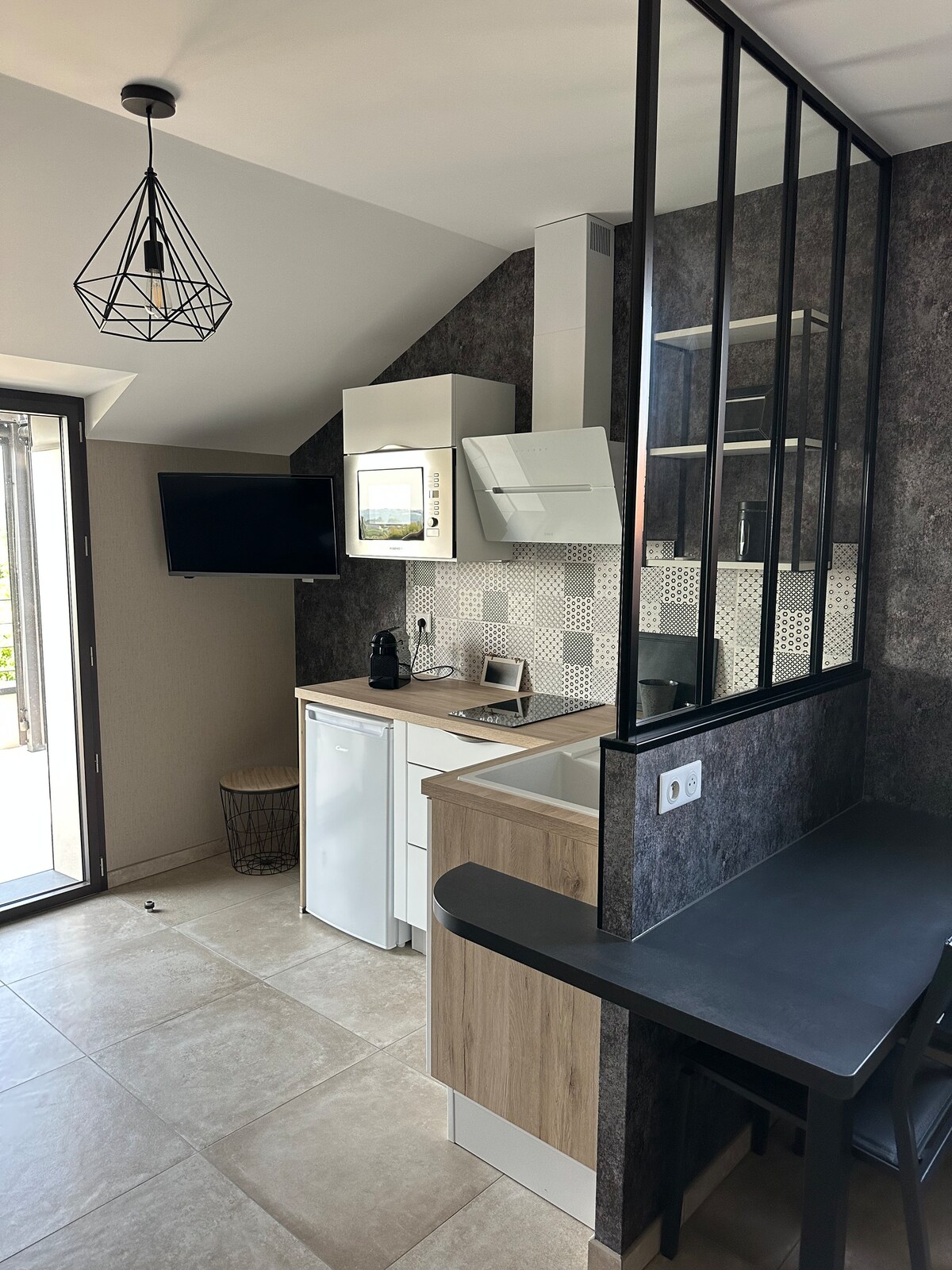 MIREPOISES – ESCAPADE INSOLITE Studio cosy de 19 m², entièrement équipé, situé au rez-de-chaussée dans une rue calme du centre-ville de Figeac. À 4 min à pied du musée et de la place Champollion. Parking gratuit et arrêts de bus (gratuit) à 2 min. Aménagement : - Pièce principale avec armoire-lit, bureau, espace TV et cuisine équipée. - Salle de douche avec WC. - Wi-Fi gratuit. - Laverie disponible dans les parties communes
